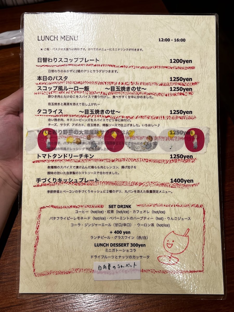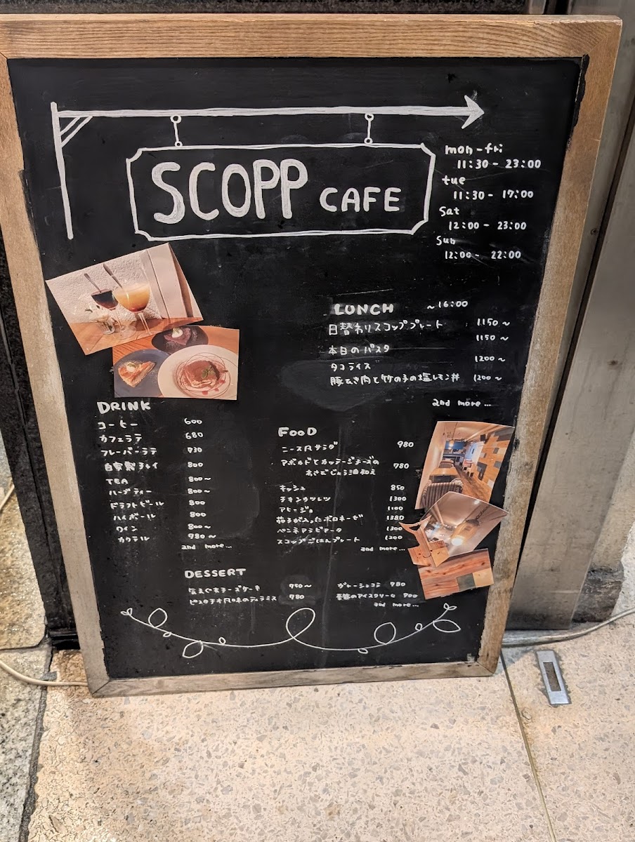Scopp Cafe boasts a diverse menu that caters to every palate. For lunch, try the daily changing スコッププレート (scoop plate), complete with a refreshing salad and a mini drink for just JP¥1,000. Later in the day, indulge in a mouthwatering 自家製ピザ (homemade pizza) or the classic ニース風サラダ (Niçoise salad), priced at JP¥2,000 and JP¥980 respectively. Don't forget to cap off your visit with a slice of their beautifully prepared ガトーショコラ (chocolate cake) for JP¥730, featuring sweet latte art that's almost too cute to eat!